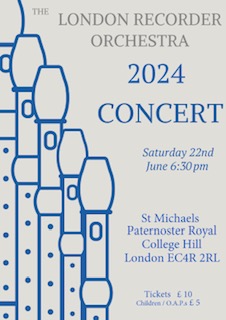 The London Recorder Orchestra will be returning to St Michaels Paternoster Royal to present our 2024 concert of music from across the centuries – from Machaut to Moses! We do hope you will be able to join us. The concert starts at 6.30pm on Saturday 22nd June – with refreshments available afterwards.